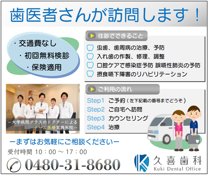 例えば、ご両親が足腰が悪くあまり動けず、歯科医院でのクリーニングなどをもう何年もしてない。などという方は是非予防の為にご連絡頂ければと思います。